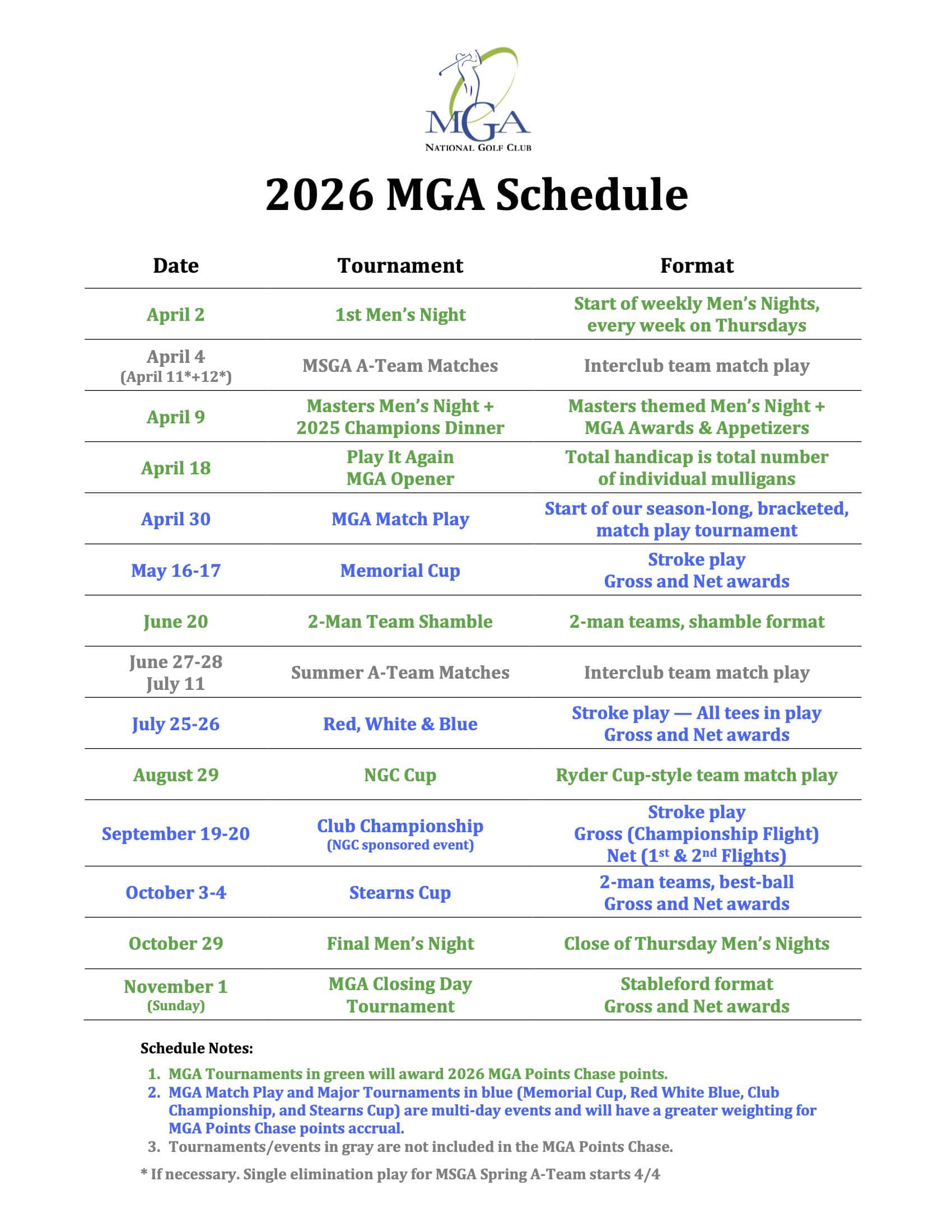 Sign-ups continue for our first weekend event of the season, the 2026 Play It Again Tournament, which will be played Saturday, April 18th with a 9:30 AM shotgun start. All weekend MGA tournaments are open to full and weekday NGC members who have paid their $85 MGA dues for the year.