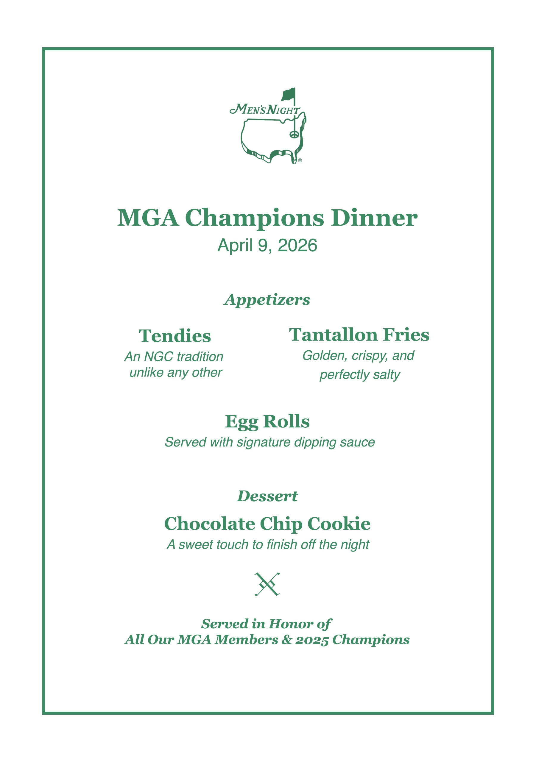 With the 2026 ANWA and Drive, Chip & Putt in the books and Live From set to take over Golf Channel 24/7, we have officially made it Masters week. And with Masters week, comes the MGA traditions of Masters Men’s Night and our Champions Dinner. For this Thursday, April 9th, we invite all MGA members, especially all the new MGA members for the 2026 season, to come out for a great day of golf and celebration at the club. We’ll have the 2025 MGA Champions trophies to hand out so we hope to have a fantastic turnout.