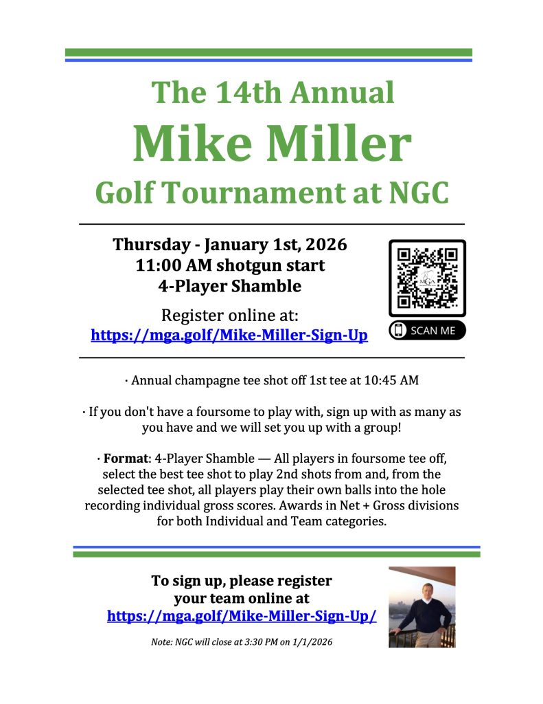 This year we celebrate the 14th annual playing of the Mike Miller Tournament. We hope you can join us — all NGC members and guests are welcome!
