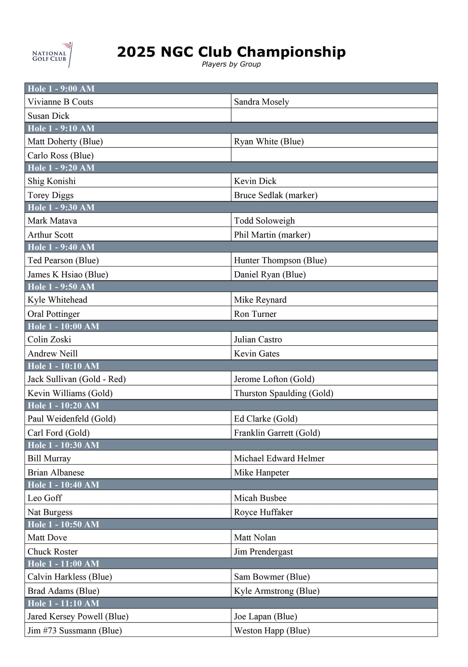 Attached you’ll find the tee sheet for tomorrow’s (9/20) first round of the 2025 NGC Club Championship. We have an excellent turnout this year and let’s have a fantastic Championship!