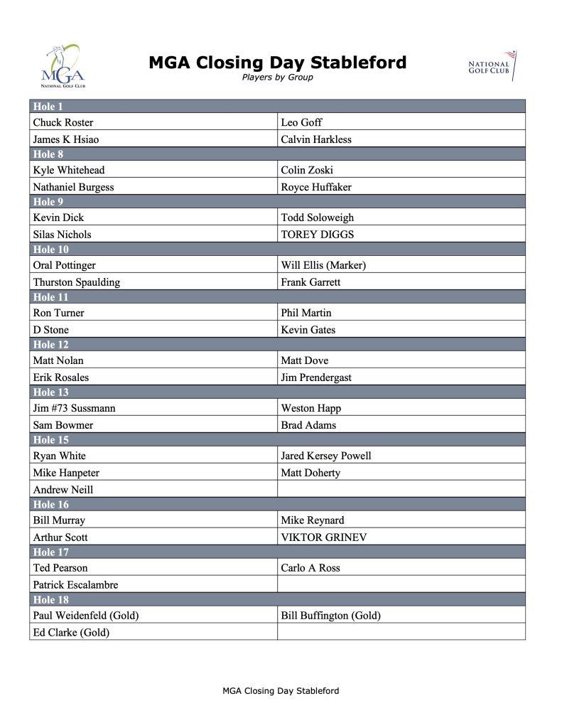 MGA 2025 Closing Day Stableford 10:00 AM Shotgun— Groups, Rules Sheet & Skins