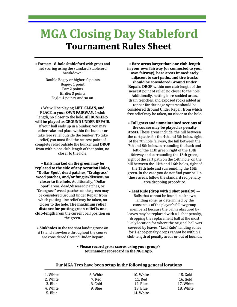 Attached you’ll find the Groups Sheet with starting holes as well as Tournament Rules Sheet for our MGA Closing Day Stableford tomorrow. We have moved back the starting time so play will begin at 10:00 AM with a shotgun start.