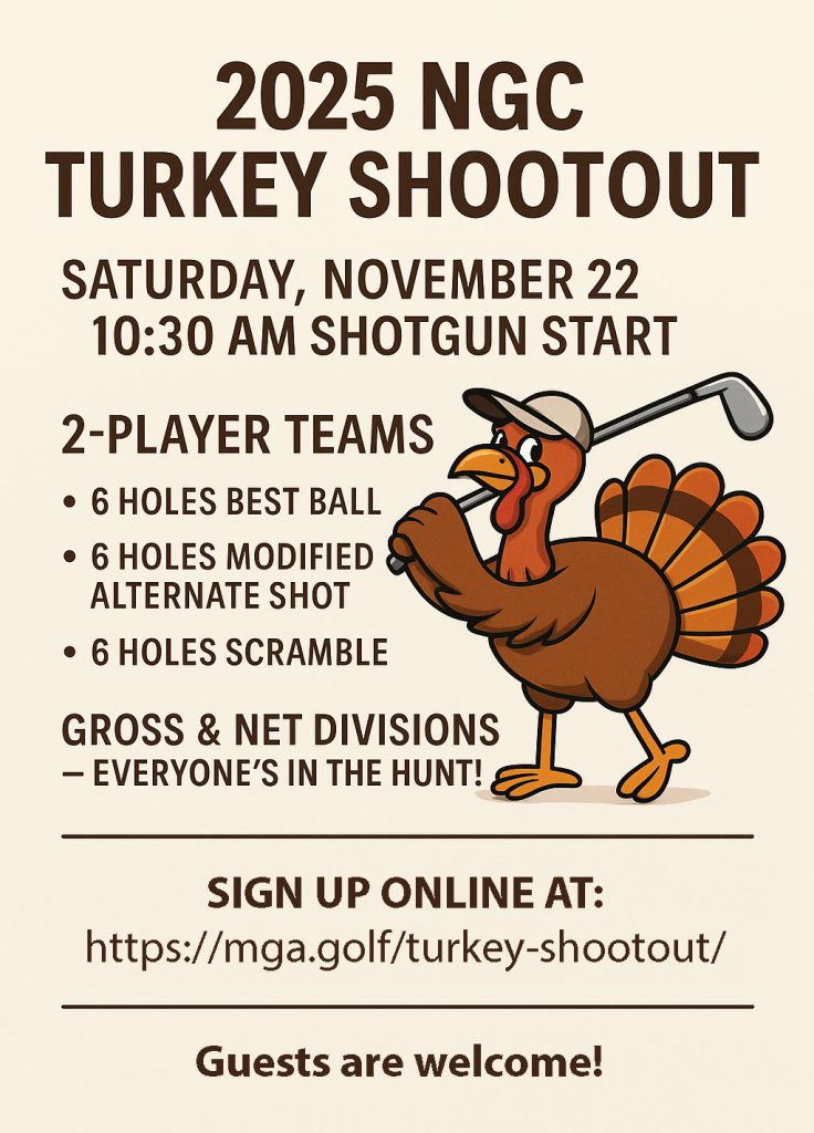 As we move into November, we’re very excited to announce the return of NGC Turkey Shootout which will be played Saturday, November 22nd with a 10:30 AM shotgun start. This festive day of golf and good cheer is open to all NGC members and their guests!