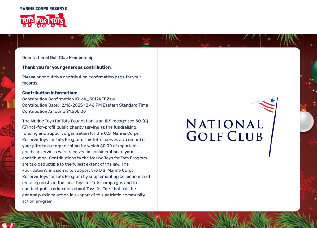 Most importantly, thanks to the legacy established by Blake and Alison Jones many years ago, we are very happy to share that together we raised $1,605 for the Toys For Tots Foundation surpassing last year’s total! This contribution wouldnβt have been possible without the amazing generosity of our NGC golf family. Thank you to all those who contributed! π